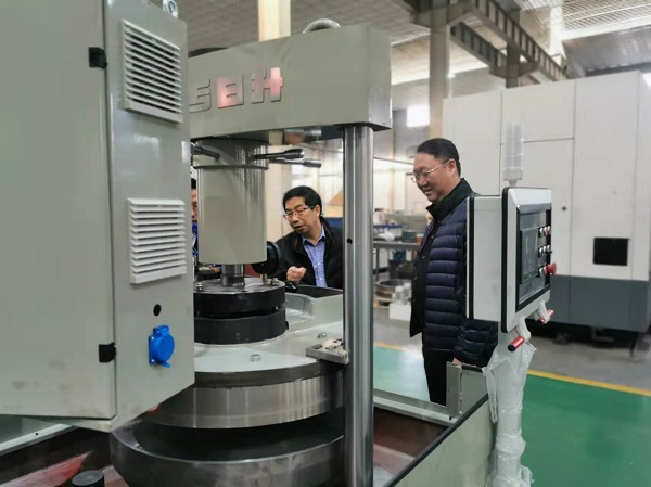 闫宁一行参观了装备生产车间,并与新乡日升总经理王世葆进行了座谈。双方就轴承套圈磨削方案和智能制造整体解决方案开发等问题进行了充分地交流讨论,一致同意加强在电主轴、砂轮及轴承整体磨削解决方案等领域的合作。