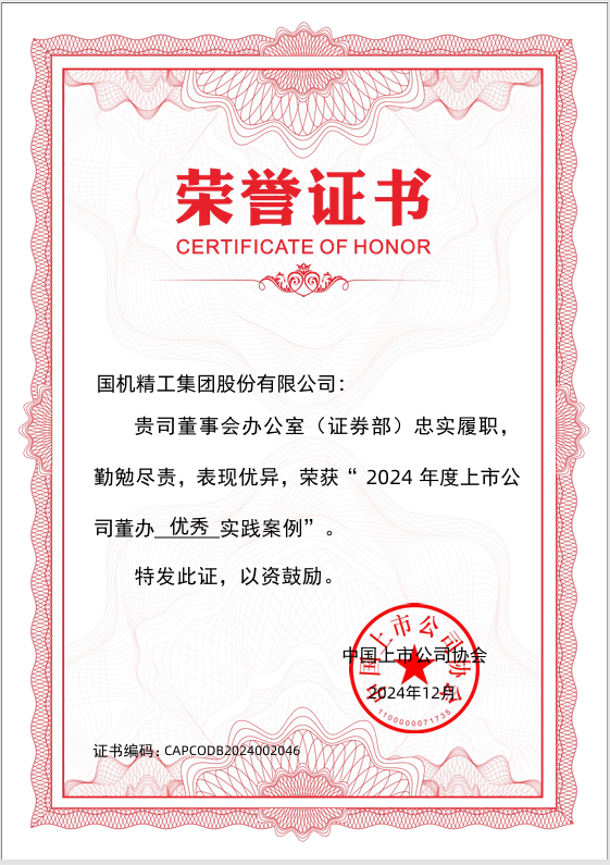 2月19日,中国上市公司协会发布了“2024上市公司董办最佳实践”案例征集活动结果。国机精工作为央企控股上市公司,凭借上市以来规范运作、信息披露、公司治理、投资者关系管理、ESG管理等方面的卓越表现荣获“2024年度上市公司董办优秀实践案例”。
