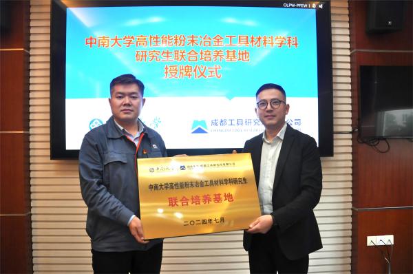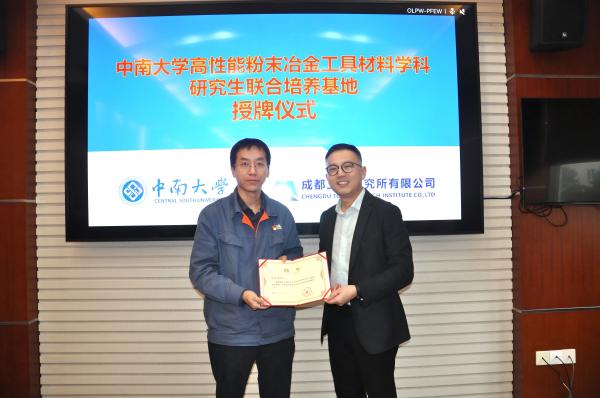 11月14日,成都工具研究所有限公司(以下简称“工研所”)与中南大学共建的“中南大学高性能粉末冶金材料学科研究生联合培养基地”揭牌仪式在工研所隆重举行。中南大学粉末冶金研究院教授张伟、工研所副总经理(主持工作)邵俊永、副总经理何荣跃、总经理助理赵金伟、数控刀具/刀具材料事业部总经理张毅等领导共同出席本次活动。